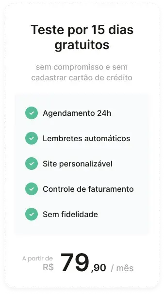 Diga quais serviços você oferece, qual a duração de cada um, qual o tempo de atendimento e em quais horários você atende. Nossa equipe te ajuda a configurar